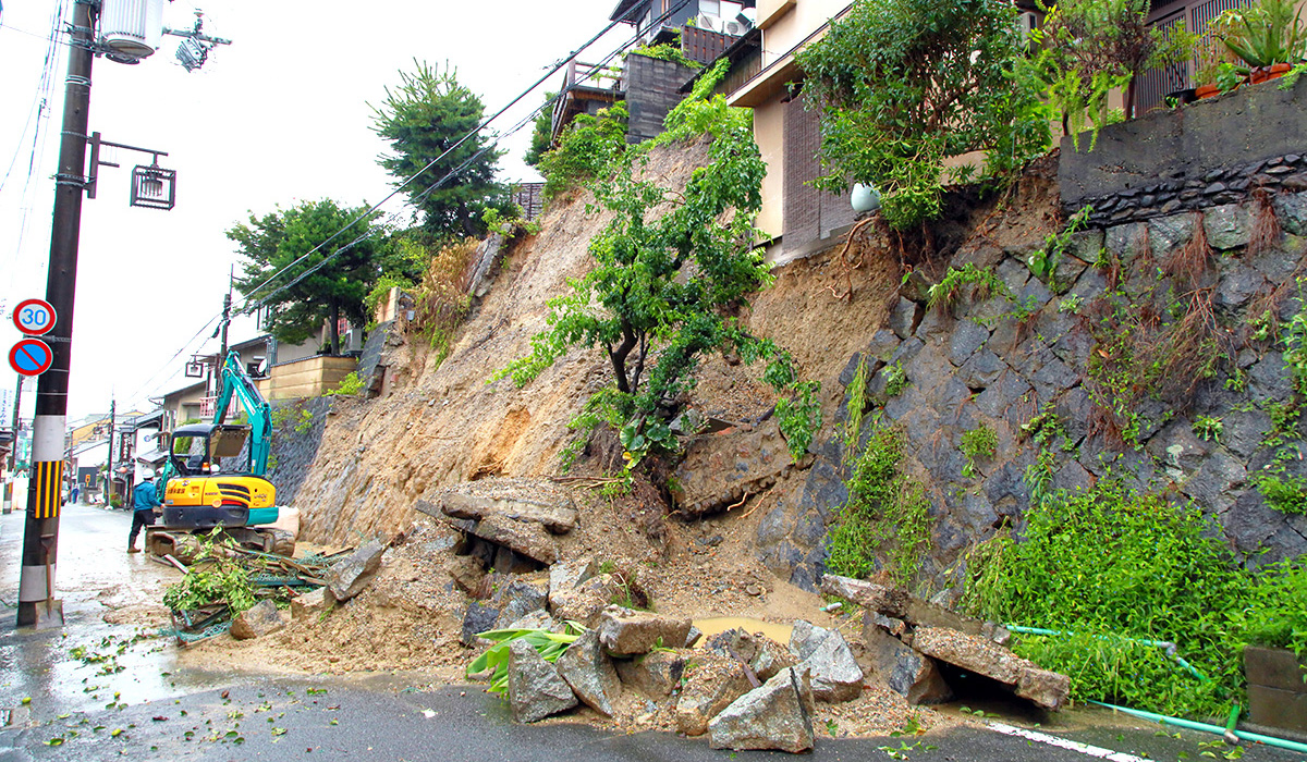 【写真2】は、2021年8月14日に京都市内の清水寺に近い住宅街で発生した崖崩れです。午前10時過ぎに発生しましたが、不幸中の幸いで怪我人はありませんでした。