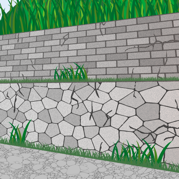 | 状況 | 開発時に自然斜面を保存。(切土斜面で植樹したケースも) 開発後は多くの場合、ほぼ無管理。 | 開発時の擁壁の上に無許可で擁壁を増築。擁壁は法律が定める工法以外で構築し、多くの場合、維持管理もない。 | 急傾斜地の崩壊や宅地造成に関する法律に従った工法で対策。 |