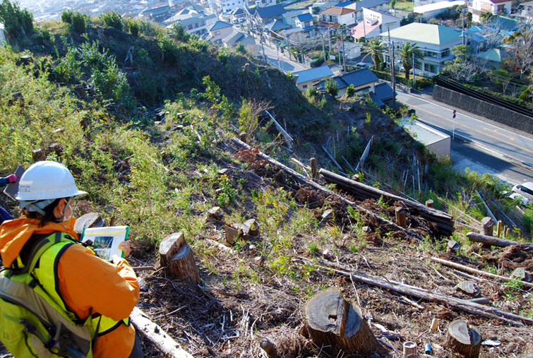 調査結果を踏まえ、想定される崩壊範囲・土砂量、影響範囲を明らかにするとともに、具体的な対策工事の方法も提案します。急傾斜地の崩壊の関連法令に沿って、都市型斜面リスクを考慮した費用対効果の高い各種対策工を提案します。