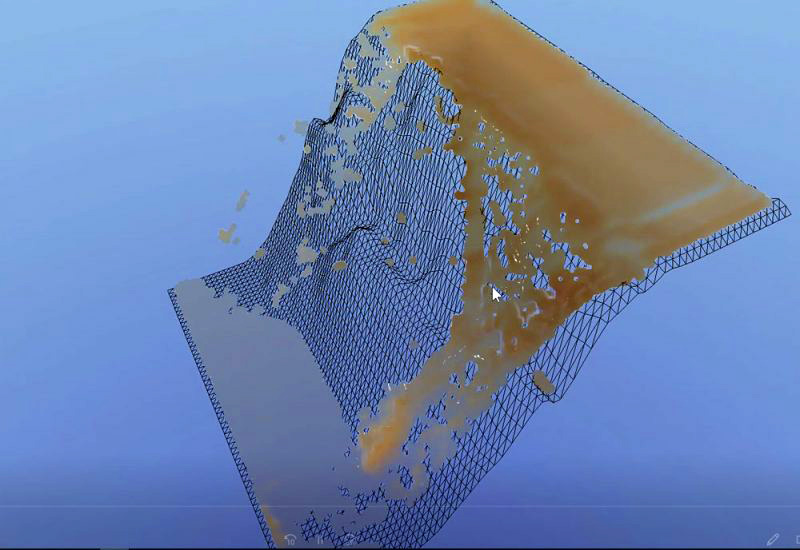 現地調査を基に対象斜面を数値モデル化し、土砂災害をコンピュータ上で再現するものです。気候変動が進行する中で、将来発生が予想される豪雨の量を入力データとして数値計算し、対象地域における斜面崩壊やその影響範囲を予測します。