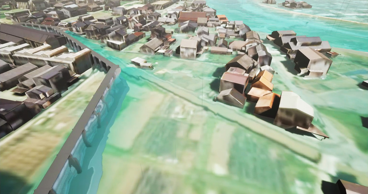堀越まず防災IoTセンサは、当社が開発・実用化している冠水センサや水位計等が実際の浸水状況や水位を検知する機能を担います。街中に設置されたカメラの映像からは、そこに映っている対象物が、水にどこまで浸かっているかをAIによって解析・判断します。SNSからは、投稿された写真などを解析する事で、どこで浸水が起こっているか、また、何センチ浸水しているかなどがわかります。これらの情報を広く集め、統合した上でマップ上に表示したり、3D映像で示したりすることで、水害の状況をリアルタイムで実感できるというものです。すでに街中に設置してある防犯カメラや、SNSの画像等を利用することで、全国を網羅する防災システムを低コストかつ迅速に社会実装できるという特徴・メリットがあります。