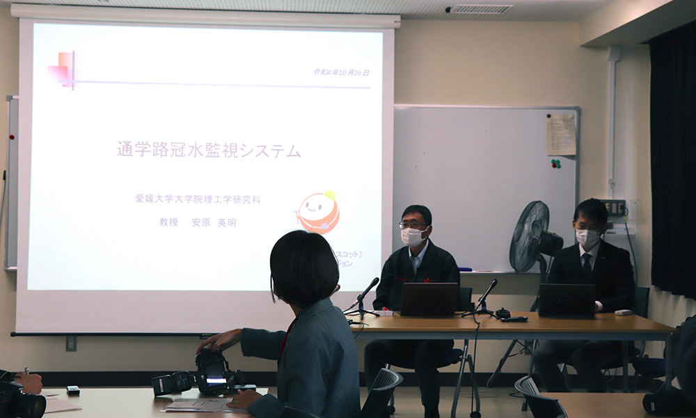 システムを開発したのは、愛媛大学(安原英明教授:四国CX研究会 会長)と応用地質。清水小学校から愛媛大学へ寄せられた相談を受け、通学路の安全を守る目的で、防災IoTセンサを組み込んだシステム設置プロジェクトが動き出しました。