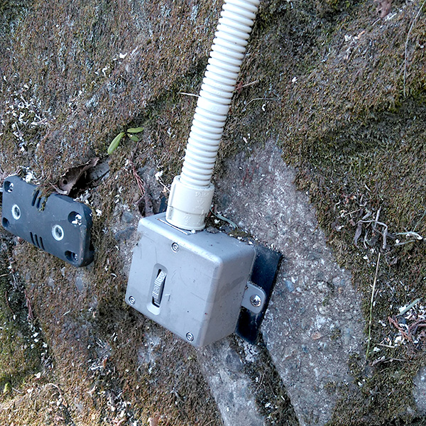 通学路冠水監視システムは、当社で開発した冠水センサ「冠すいっち」とカメラで構成されます。冠すいっちは、川の増水を多段階で検知し、関係者に危険を知らせるセンサです。冠水センサを河川の護岸に「低・中・高」と危険度レベルに合わせた高さに設置し、川の増水で各センサが水に浸かると、登録されたメールアドレスに自動でメールが発信されます。カメラは通学路の橋と水面を映すように固定して設置され、毎朝5時に自動で撮影し、その映像がクラウドにアップされる仕組みになっています。
