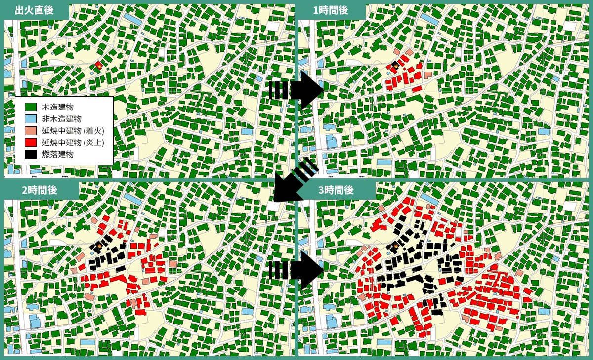 防災分野を代表するサービスが、地震動や津波高の高度な解析による被害予測を元にした、国や自治体の防災計画策定の支援です。地震や強風によって引き起こされる大規模火災の延焼シミュレーションにも実績があり、消防分野の防災にも貢献しています。