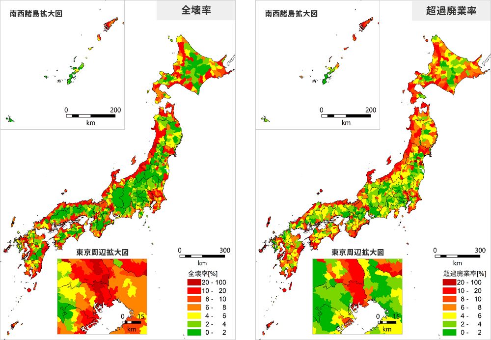 これらの要因を示す統計データから試算された市区町村ごとの災害による廃業リスクを【図4】に示します。【図4】の左側は全壊率、右側は廃業リスク (超過廃業率) を示しています。ここでの廃業リスクは、それぞれの地域の直下4kmでM6.8の地震が発生した場合の全壊率や人口減少率などに基づいて算出した超過廃業率です。(津波被害の影響は考慮していません)