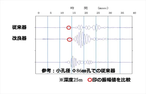 海外では一般的な大型のドリルシップを用いたCPT調査は、日本でこれまで行われてきたボーリング調査に比べて作業効率やコストの点で優位である一方、調査孔が大孔径であるため、通常のサスペンションPS検層器を用いたPS検層では、S波波形が読み取りにくくなり、データ品質が悪くなるという課題がありました。