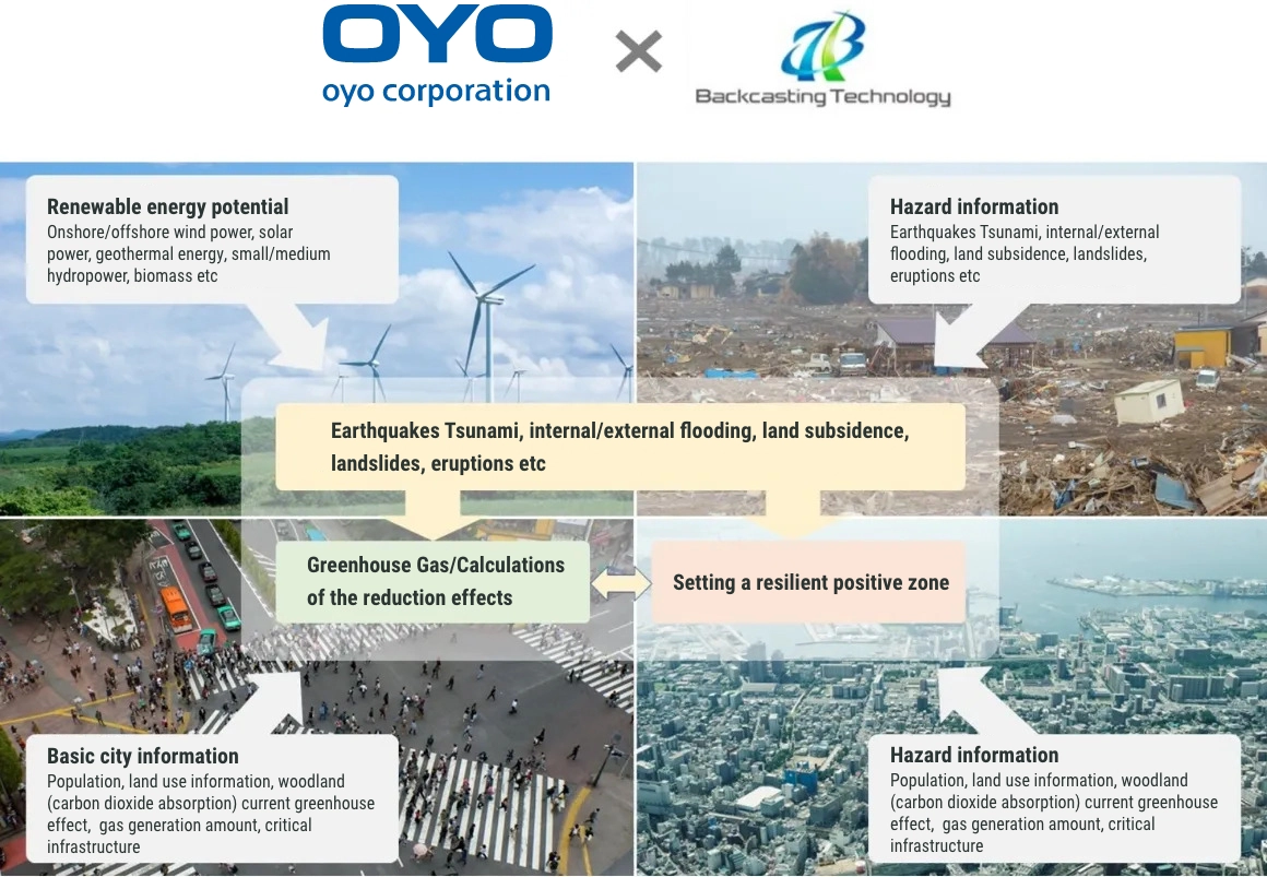 Our company and Backcasting Technology Co., Ltd are combining our expertise, including our potential assessment technology for renewable energy, probability calculation methods for disaster risks associated with global warming, various databases concerning demographics, hazards, infrastructure, and Backcasting Technology Co., Ltd consulting services in greenhouse gas reduction and backcasting methodology for designing future scenarios.