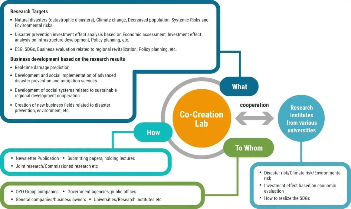 The OYO Group has been actively pursuing comprehensive solutions in response to these challenges. In our mid-term management plan, "OYO Jump18" established in 2018, we emphasized our intention to collaborate with companies and institutions both within and outside the Group, including those in different industries. Furthermore, in our current mid-term management plan, "OYO ADVANCE 2023," we have formulated an innovation strategy centered on digital transformation (DX) and are driving business service reforms based on the premise of co-creation with other companies, government entities, and universities.
