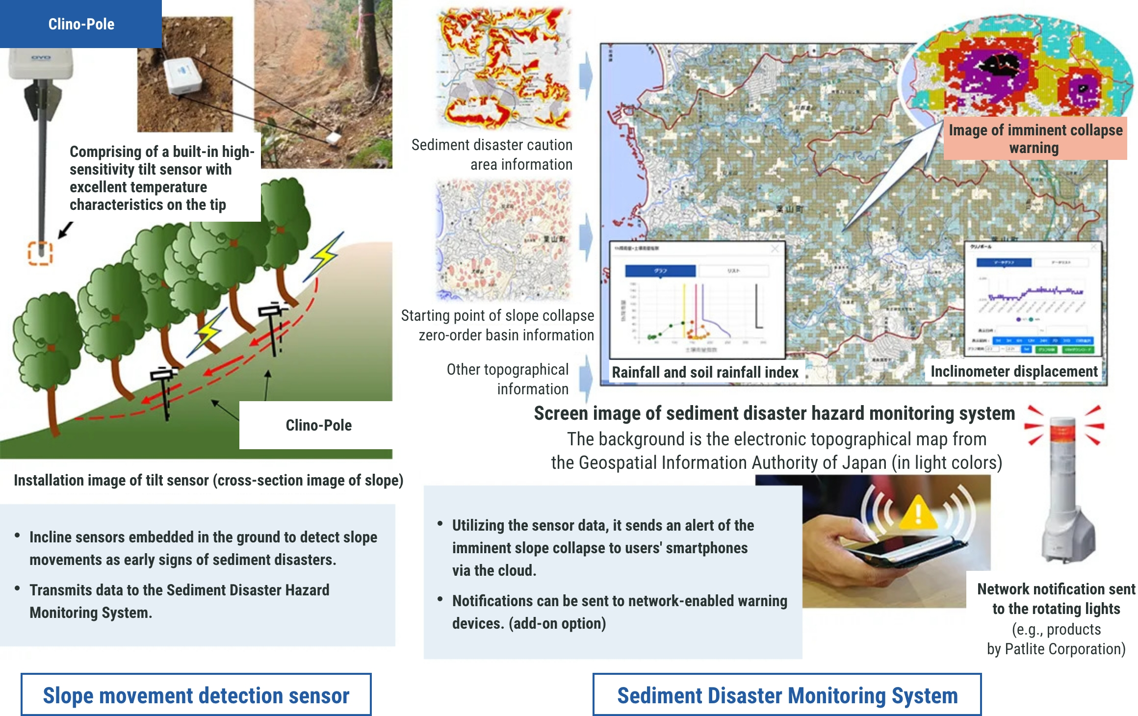 We have installed and are running our "Slope Movement Detection Sensors" and "Sediment Disaster Hazard Monitoring System" to verify the effectiveness of early detection of the signs of soil erosion and establish optimal methods to inform residents of evacuation actions based on the detected information regarding the premonitions.
