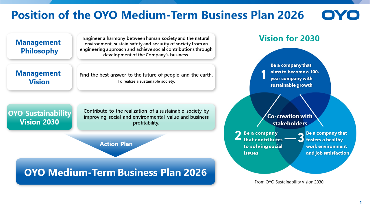 The OYO Sustainability Vision 2030 sets a new vision of what we want to be in 2030 to embody our management philosophy and vision. We aim to achieve this vision through the OYO Medium-Term Business Plan 2026 by enhancing social and environmental value while also increasing business profitability to contribute to the realization of a sustainable society.