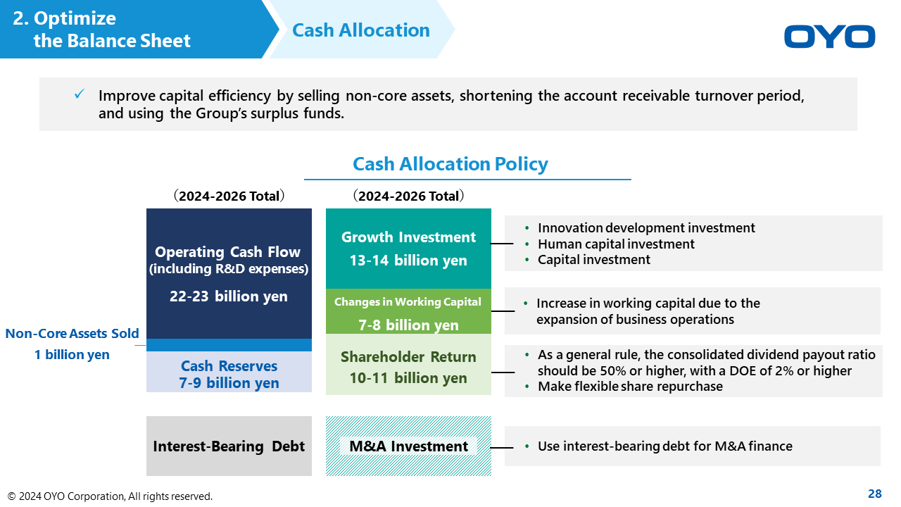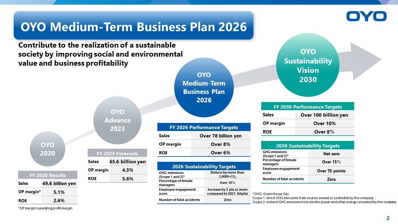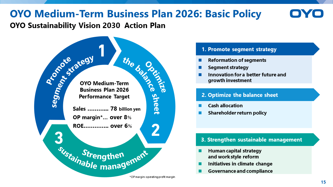 The OYO Medium-Term Business Plan for 2026 is based on three policies: to promote segment strategy, to optimize the balance sheet, and to strengthen sustainable management.