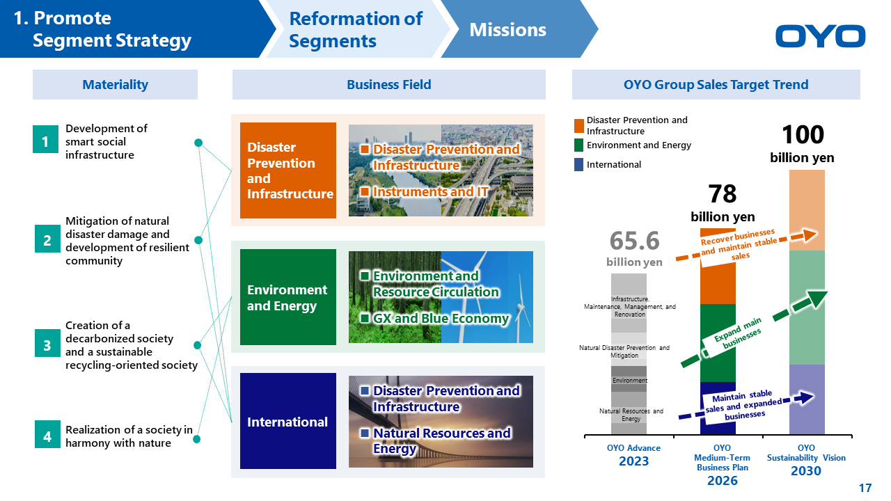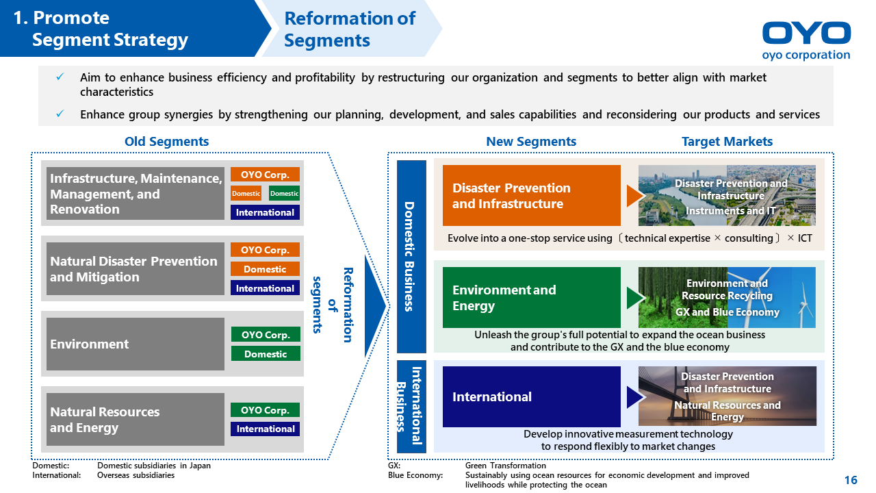 We have separated our domestic and international businesses to streamline operations. Our domestic business is consisted of two segments - "Disaster Prevention and Infrastructure" and "Environment and Energy." Additionally, we created an "International" segment that comprises the businesses of our overseas subsidiaries. Our aim behind these changes is to maximize group synergy, reform our products and services, and strengthen our planning, development, and sales capabilities.