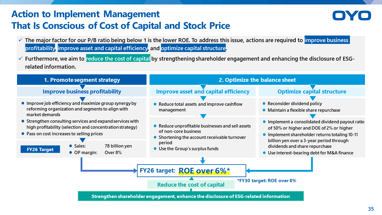 We will strive to improve PBR by pursuing "improvement of business profitability," "improvement of asset/capital efficiency," and "optimization of capital structure" with the goal of achieving ROE 6% or higher.