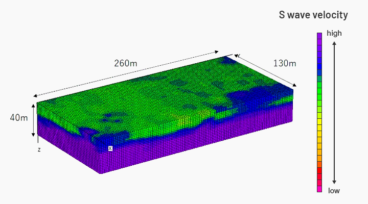 3D Microtremor Array Survey continuously visualizes the planar depth distribution of the bearing stratum. The figure above shows the S wave velocity structure (Fig. 1) of the bearing stratum in the construction project and the estimated bedrock depth distribution (Fig. 2) created with calibration from a borehole survey. Visualizing the bearing stratum distribution in a planar manner makes it possible to suppress the increase in pile construction costs and delays in the construction period. It also significantly reduces the number of borehole surveys, thereby contributing to increased efficiency for the entire project.