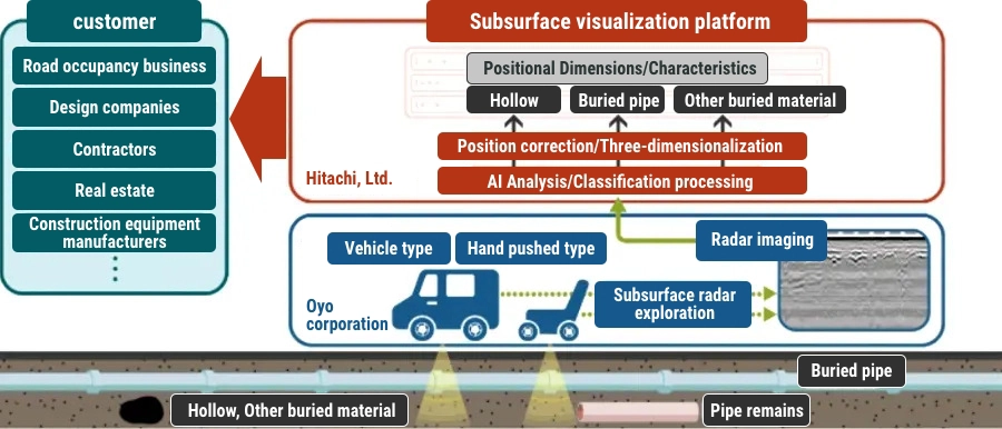 The underground visualization services visualize and map the accurate 3D position information of underground infrastructure located beneath roads in urban areas. The services use a 3D ground penetrating radar exploration vehicle developed by OYO Corporation and AI analysis technology developed by Hitachi, Ltd. The services are centrally managed and provided on a platform. Via the cloud, users can obtain on-demand information on underground infrastructure at any location they need and at any time.