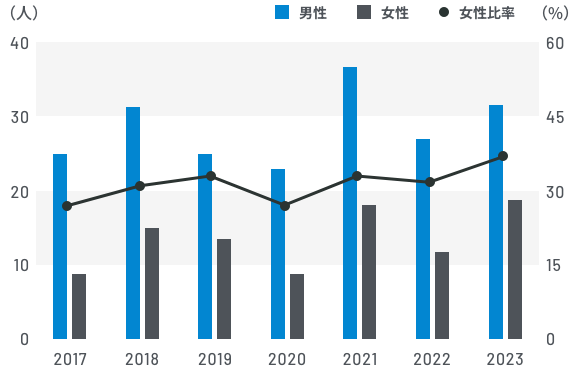 当社では、D&Iの観点から、女性の採用を増やしてきました。ここ8年間では、新卒採用における女性比率は平均31%です。