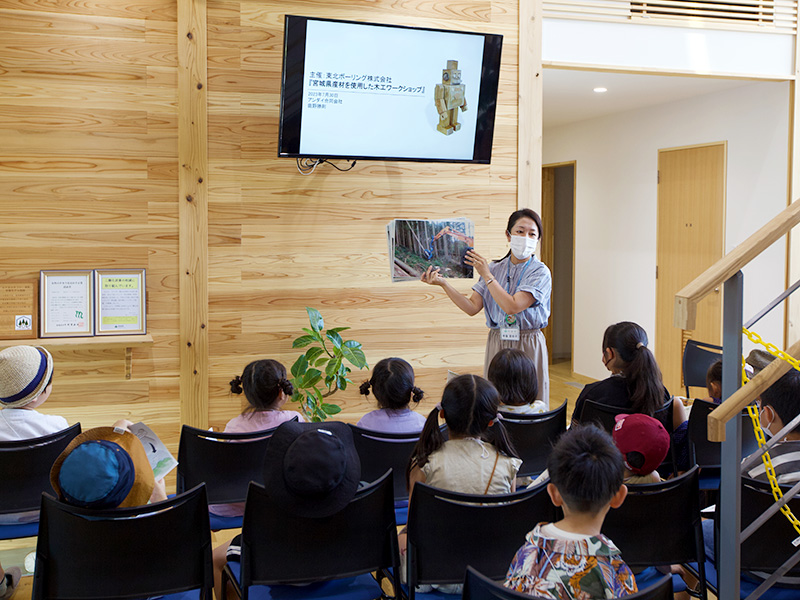 木造「ZEB」化普及に向けた取り組みとして、地元産の木材利用、再生エネルギーとして地中熱と太陽光発電を利用した社屋を建設しました。エネルギーの地産地消を目指しています。