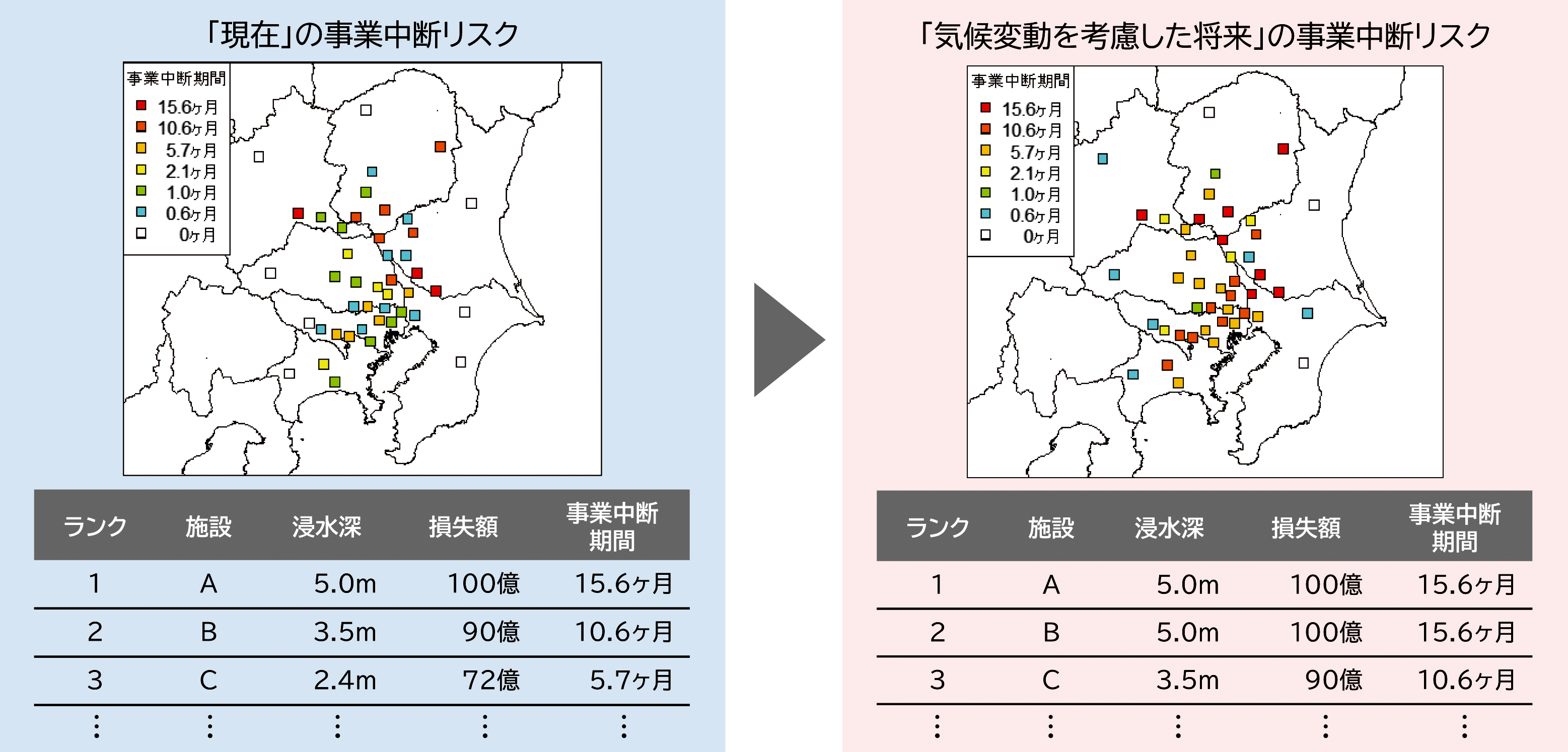 現時点と気候変動を考慮した2100年時点の自然災害リスクを評価可能とし、事業者の気候変動対応の優先順位の意思決定、TCFD対応などに貢献できます。