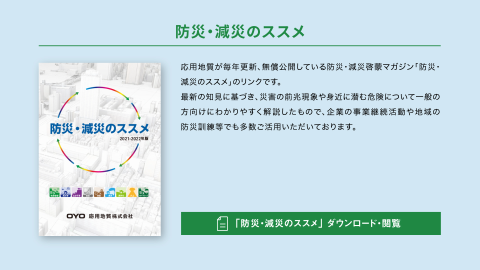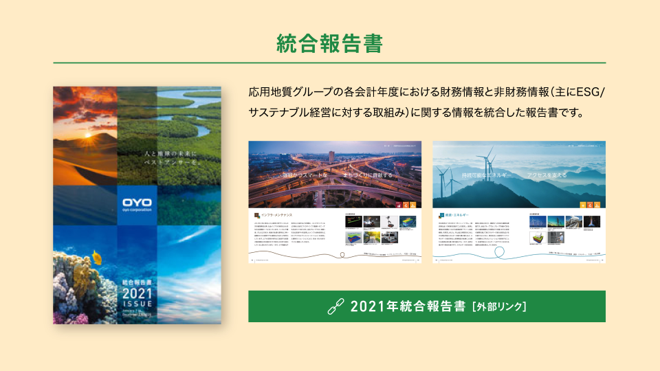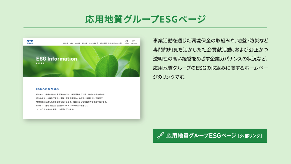 応用地質グループでは、現中期経営計画『OYO ADVANCE 2023』において、「サステナブル経営を基本方針に、本業を通じた「社会価値」「環境価値」「顧客価値」の3つの価値の最大化を表明しています。本動画では、ESGの各観点から、弊社グループの事業活動を通じた環境課題への貢献、多様性・女性活躍推進、働き方改革、社会貢献活動、ガバナンスの各種施策など、サステナブル経営に向けた取組みの事例をダイジェストで紹介しています。