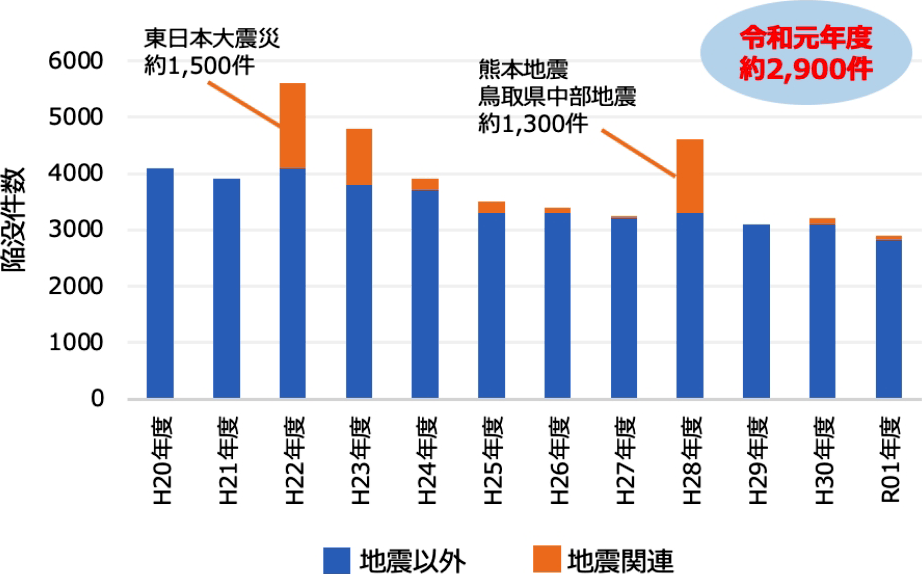 日本では現在、年間9,000件超の道路陥没が発生しており、そのうち、地下に埋められた管路の老朽化が陥没の主な原因です。