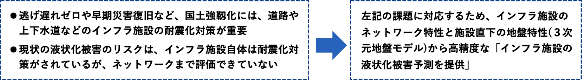 インフラ施設全体の液状化被害リスクを評価する場合、ハザードマップのような液状化被害予測の面的な分布とネットワークを構成している構造物等の要素の重ね合わせを行うことが必要です。しかし、道路や下水道等の線状で広域的な広がりを持つインフラ施設は、地域ごとの地質・地盤状況や液状化リスクが把握されていないため、インフラ施設直下及びその周辺の地盤特性を整理し、液状化被害が推計可能な地盤構造モデルを構築する必要があります。また、既存の液状化ハザードマップは広域の一律評価となっており、インフラ施設の液状化被害を表現するのに必要な地盤情報とメッシュ密度が不足しています。