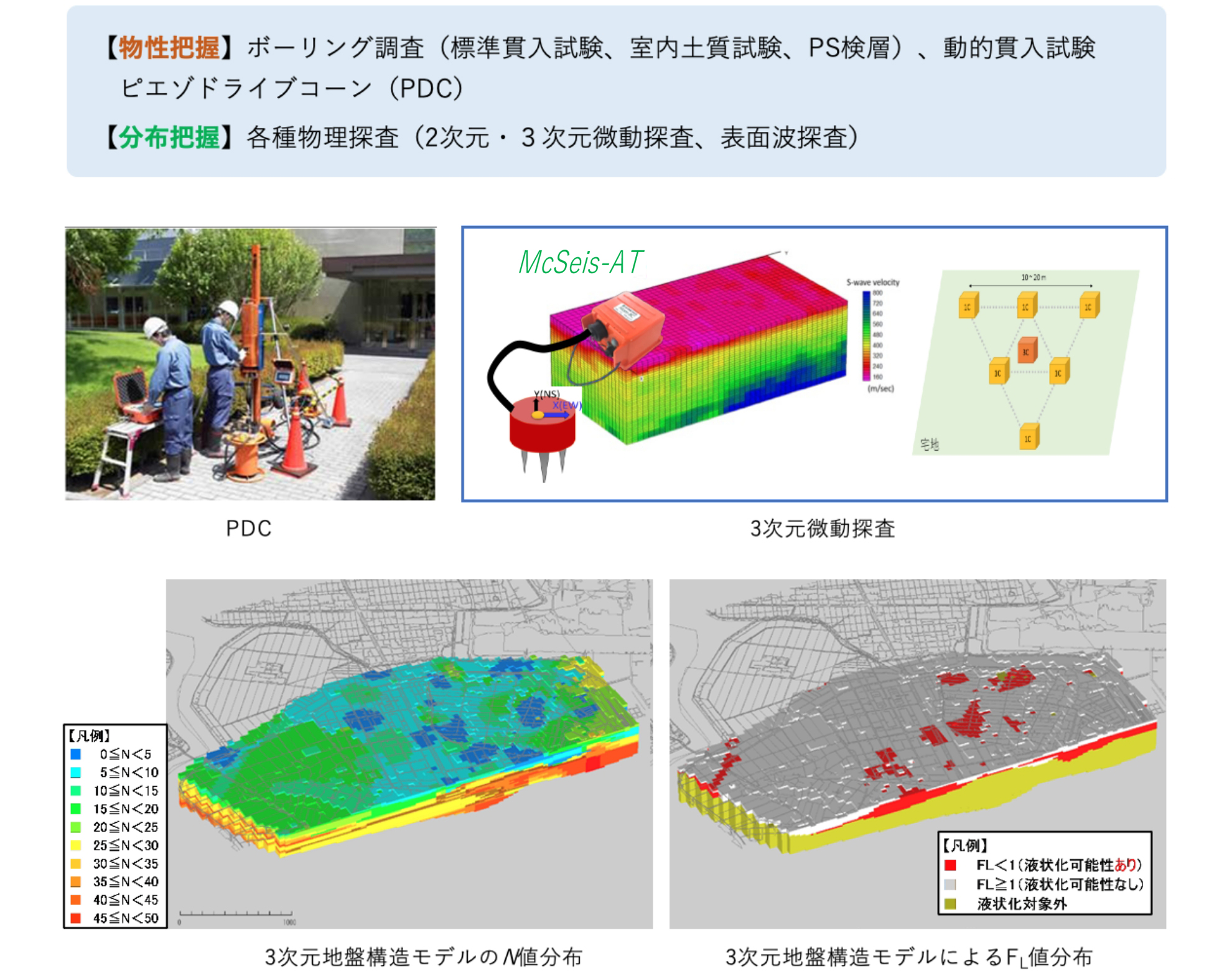 従来の手法では、ボーリング調査結果を基に地盤モデルを作成しており、調査データがない部分は地盤の複雑さが十分に反映されません。本手法では、従来のボーリング調査に加え、PDCや物理探査を併用することで、地質・地盤の分布の複雑さや連続性、液状化被害要因となる地盤特性を把握し、それらを反映した3次元地盤モデルを作成します。