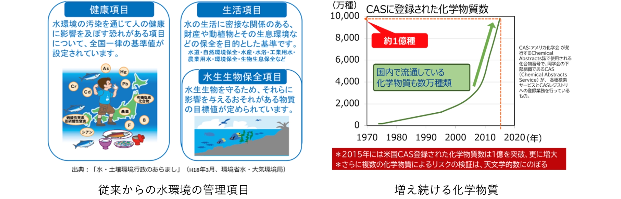 従来からの水質管理では、専ら何の有害物質をどこの系外に排出するかによって、重金属やVOC、農薬などの有害物質項目(健康項目)、pH, BOD, COD, SSといった生活環境項目、および全亜鉛、ノニルフェノールといった水生生物保全項目について、それぞれの地域性や希釈などを鑑み環境基準値が設定されています。ところが、そのような限られた基準物質以外に、世界中で化学物質がどんどん新規につくられており、毎日1万種以上にも上ると言われています。その伸びは今後も増え続けることが予想されており、これまでの環境管理の方法では十分な知見が及ばないリスクをはらんでいます。