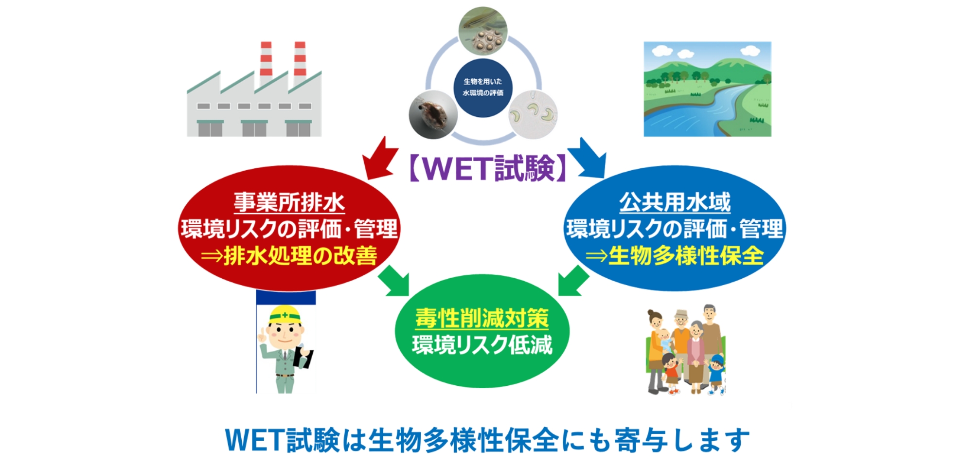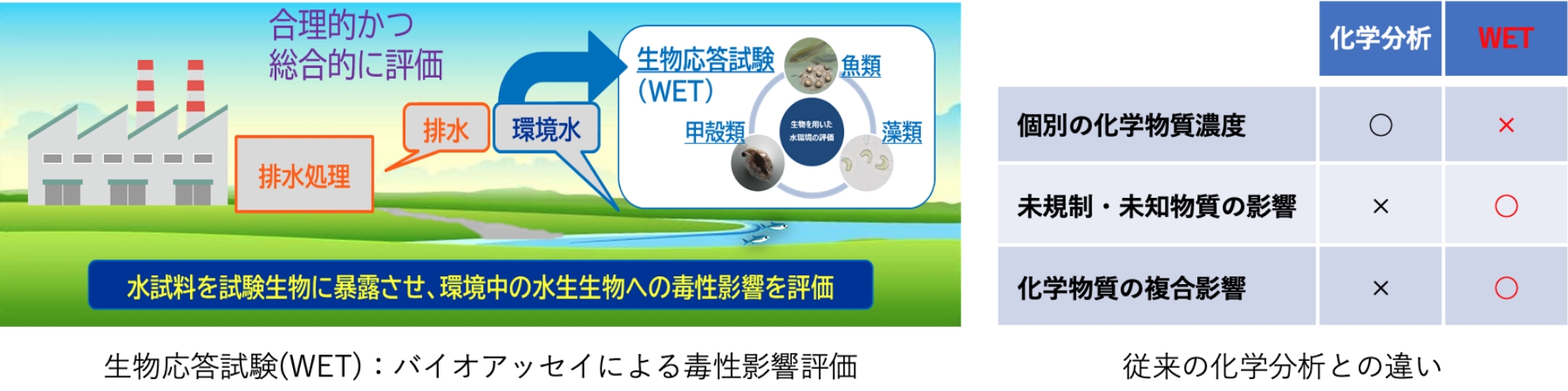そこで課題解決として、WETと呼ばれる生物による応答…バイオアッセイを用いた毒性評価が提案され欧米を中心に普及が進んでいます。WETとはWhole Effluent Toxicity(日本語では「全排水毒性」)の頭文字をとったものです。2019年には生物応答試験を用いた排水の評価手法とその活用の手引きが環境省より発行されています。