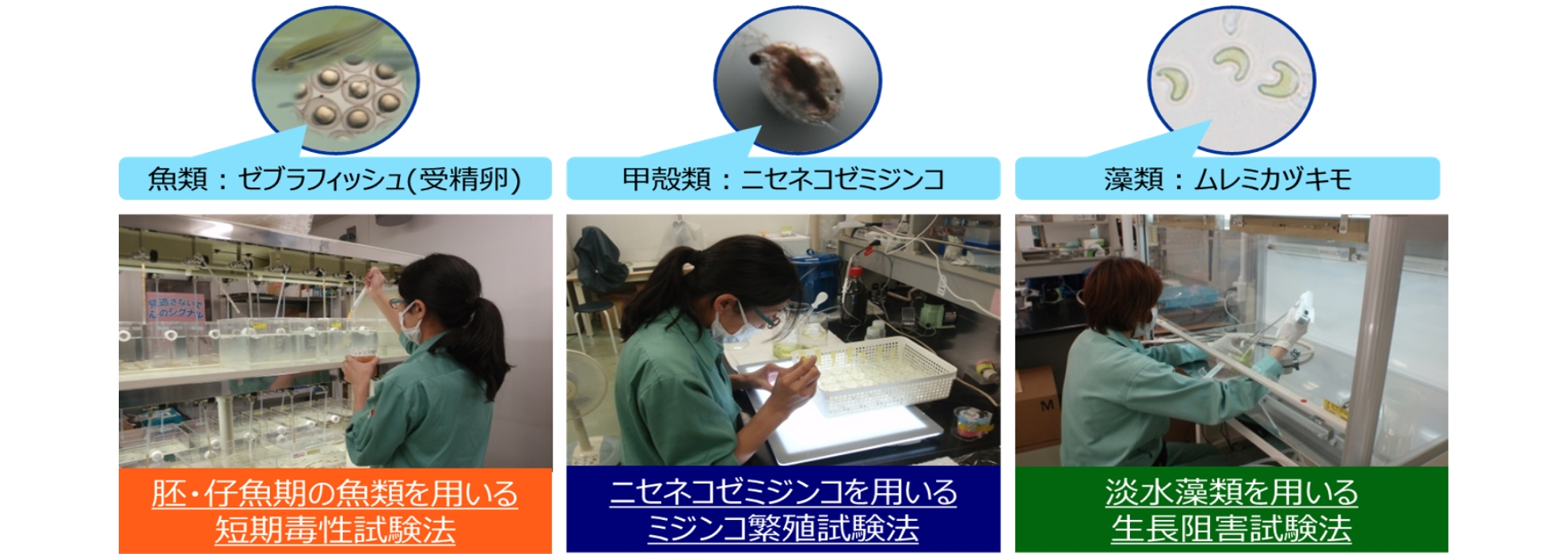 下図左の魚類は、受精卵がふ化し生存しているかどうかを ゼブラフィッシュを用いて確認したものです。下図中央の動物プランクトンは生殖異常がないかどうか ミジンコで確認したもの、また下図右の藻類は、成長阻害がないかどうか ミカヅキモで確認をしたものです。このような手法で毒性影響の把握を進めていきます。