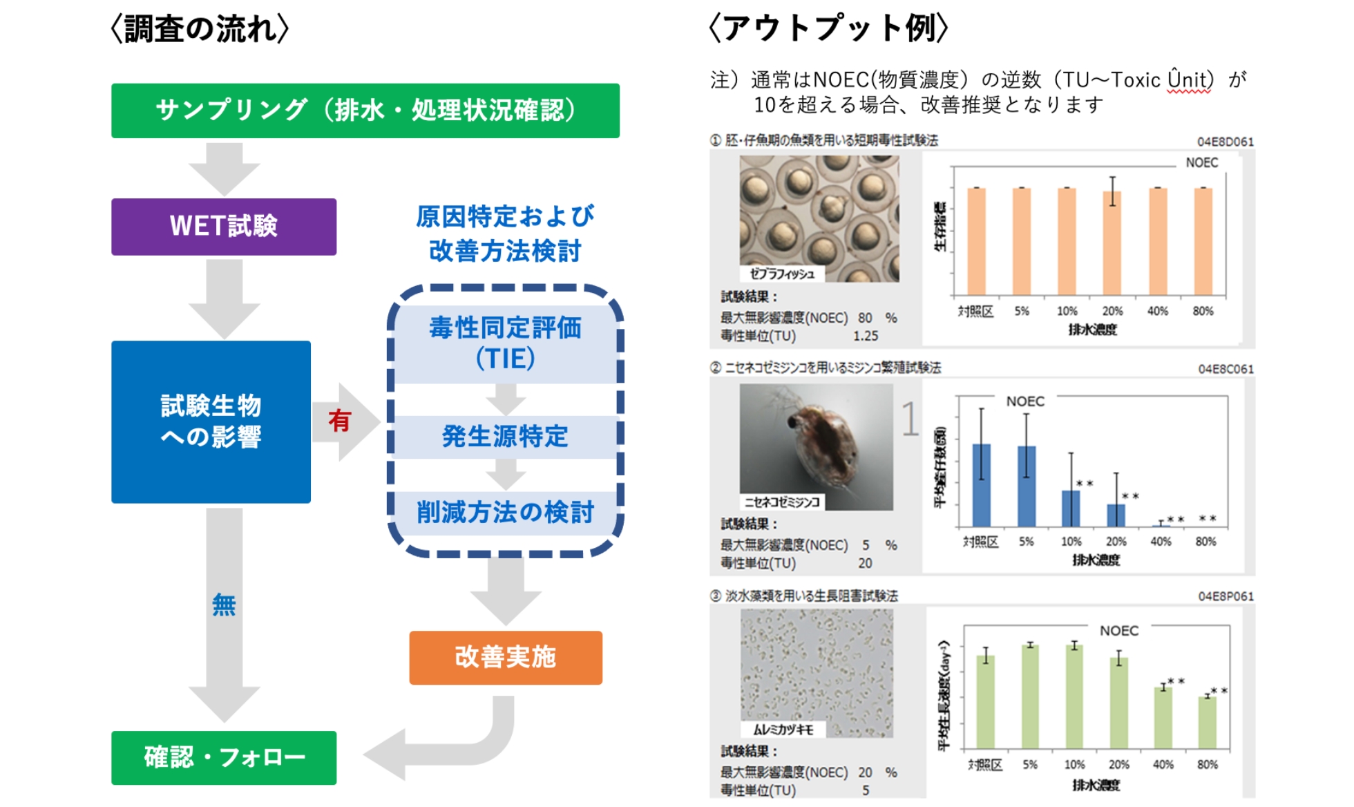 生物応答試験(WET)を用いることで、個別物質の化学物質濃度による判定は出来ませんが、従来の化学分析では出来なかった未規制物質・未知物質の影響や、化学物質同士の複合影響の検討ができます。WETは、一般に水試料を甲殻類、魚類、藻類の試験生物に暴露させ、その毒性影響を把握するものです。