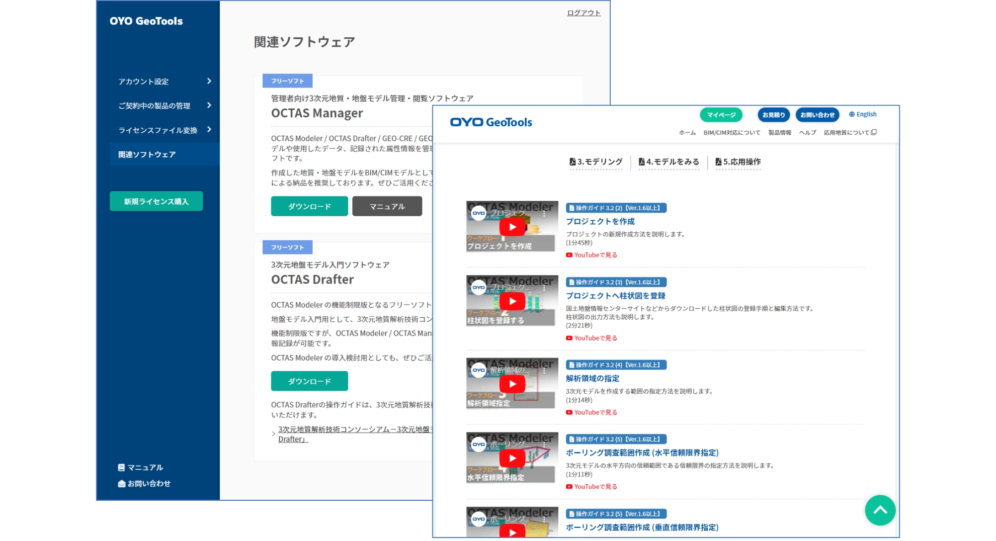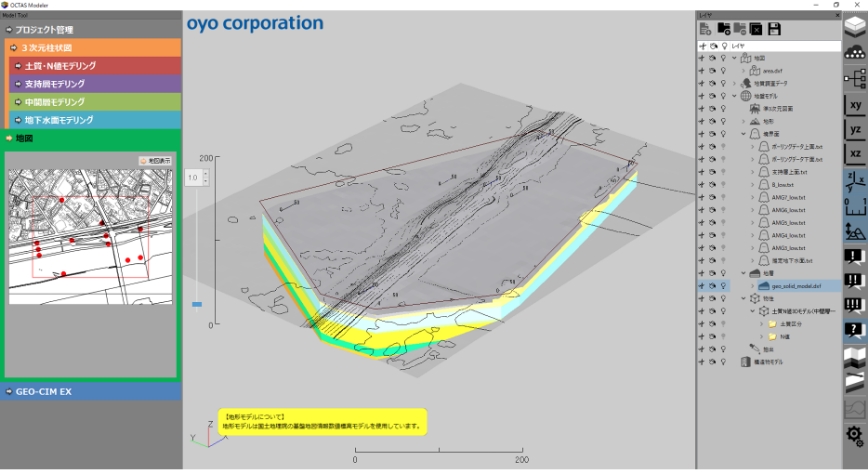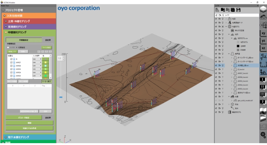 応用地質が提供するフリーソフト『OCTAS』の手軽さに、GEO-CREの地質・地盤モデリングのノウハウを融合し、より少ない手順で3次元地盤モデリングを可能にしたアプリケーションです。平野部における土木施工において、特に課題となる軟弱地盤対策にも活用いただくことができます。コンパクトな3次元地盤情報データベースとしても利用可能です。