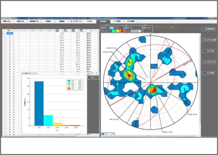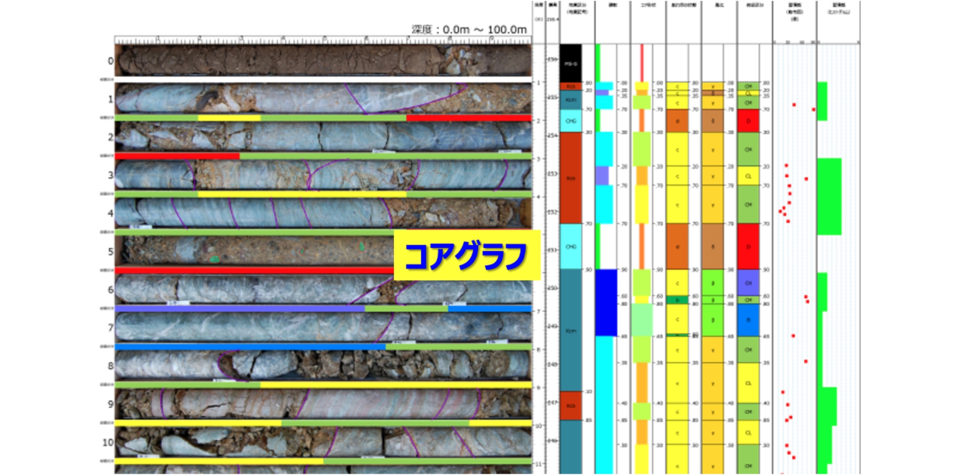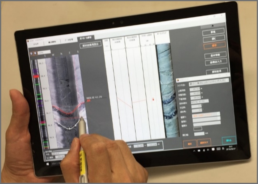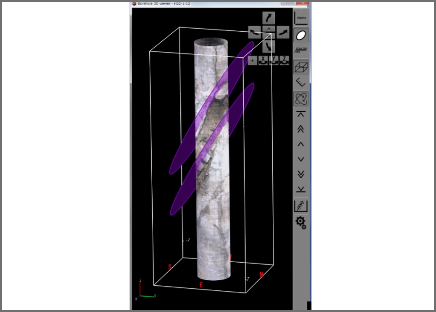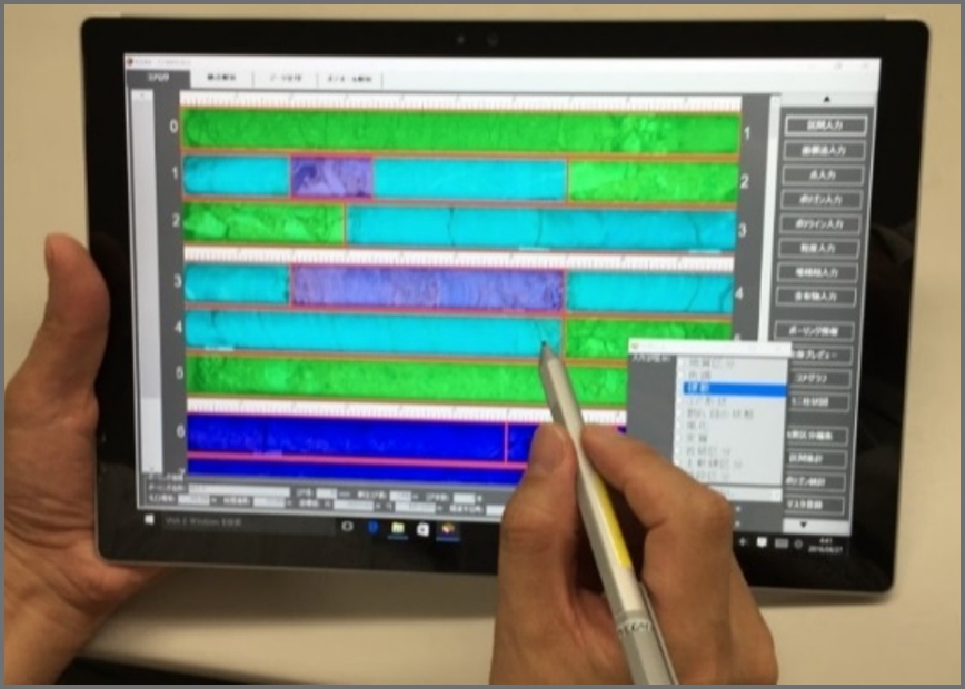 COREROKUは、地盤工学的評価の基本となる多元的なコア観察やボアホール孔壁に関する情報を可視化するアプリケーションです。エビデンス蓄積のためのデータ整理作業と地層構造解析作業を支援します。GEO-CRE ProにはCOREROKUが搭載されており、ボアホールの地質構造を3次元可視化して地質解析に利用することができます。