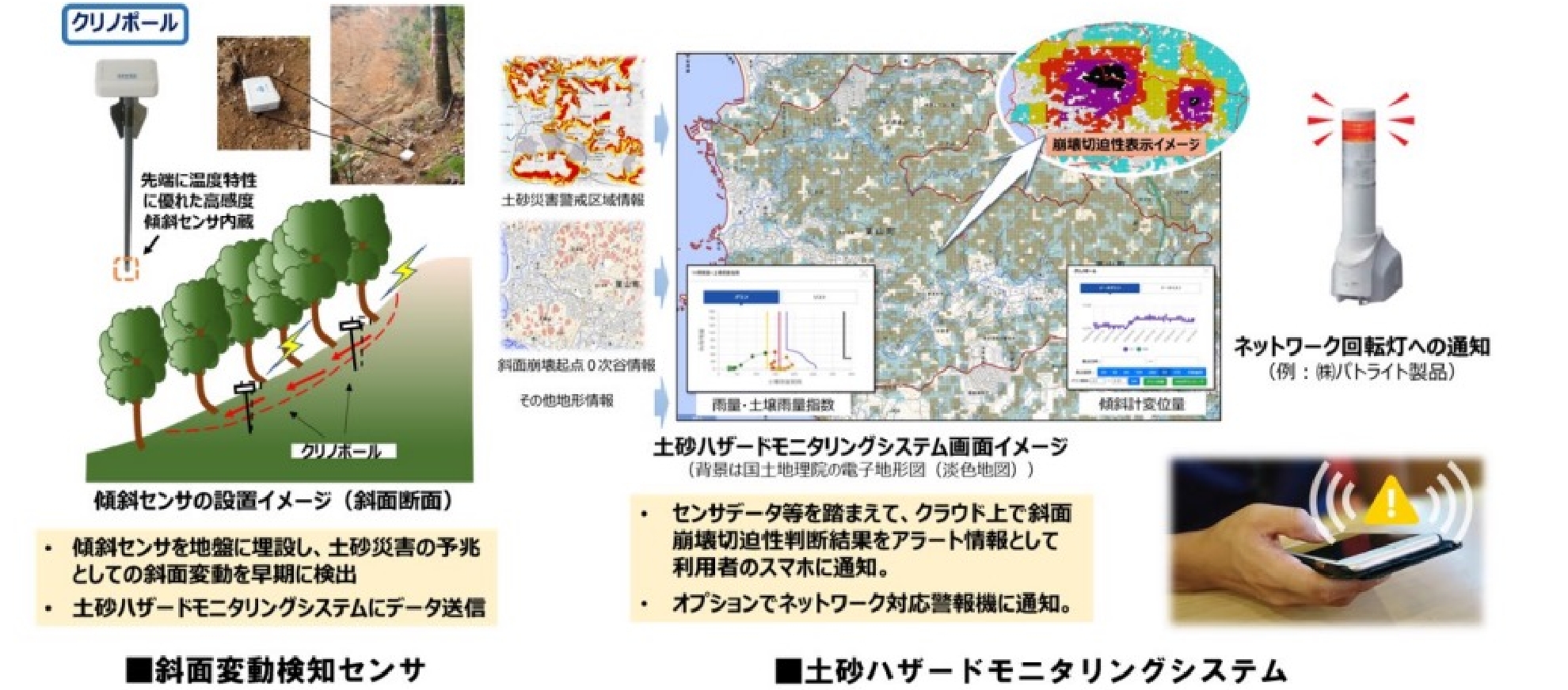 気候変動等の影響により、全国で豪雨による被害が増加しています。神奈川県葉山町内においても近年は急傾斜地の崩壊など土砂災害の発生が懸念されているため、葉山町と応用地質は、土砂災害から住民を守る新たな防災システムの構築を目的に連携協定を締結し、実証研究を開始しました。応用地質が開発した「斜面変動検知センサ」と「土砂ハザードモニタリングシステム」を葉山町における土砂災害危険斜面に設置・運用し、土砂災害の予兆の早期検知の有効性を検証するとともに、検知した予兆情報をもとに住民の適切な避難行動につなげるための最適な周知方法の確立等を目指しています。