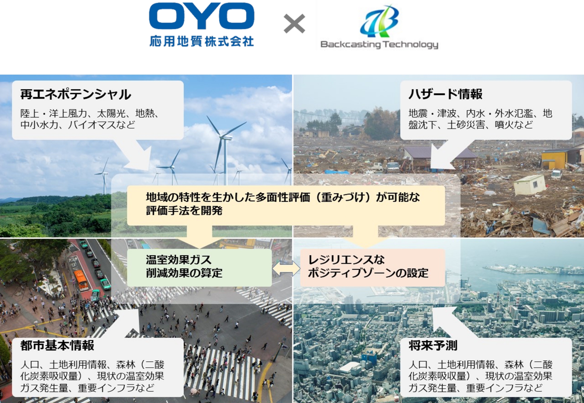 応用地質と BCT 総研は、応用地質グループの保有する再生可能エネルギーのポテンシャル評価技術や、温暖化に伴う災害確率算定手法、人口動態・ハザード・インフラなどの各種データベースや、BCT総研の保有するバックキャスティング手法を用いた地域の未来デザイン、温室効果ガス削減コンサルティング等を組み合わせ、脱炭素・持続可能な地域づくりに向けたソリューションの開発を目指しています。
