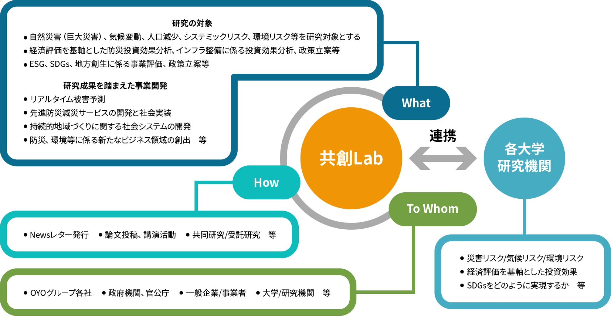 共創Labは、大学等の研究機関と連携し、オープンイノベーションを軸とした研究体制で活動します。研究成果は、学会等での論文発表やメディアを通じた公表などにより社会に広く発信・提言します。またOYOグループは、研究成果をサービス・ソリューションに昇華させ、社会実装を目指します。