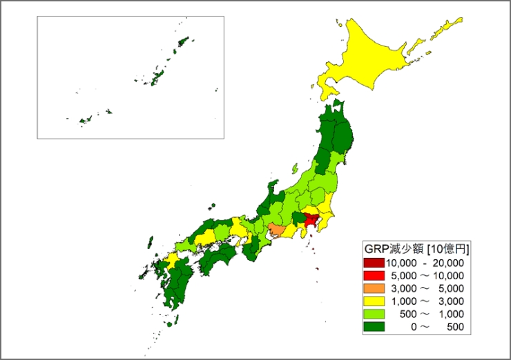 関東地震の再来で生じるストック被害だけでなく、GDPや産業の活動水準といったフローの経済指標に与える影響を経済モデル(空間応用一般均衡モデル)により推計しました。右図は地震発生から1年間で生じた都道府県別の域内総生産(GRP)の変化額(単位10億円)を示したものです。これを全国で合計した国内総生産(GDP)の変化額は最初の1年間で約61兆5千億円の減少となります。平時の年間実質GDPに比べ約11.2%の損失となり、深刻な経済ショックとなることが予想されます。