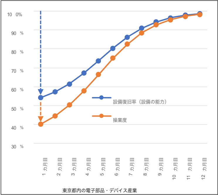 空間応用一般均衡モデルは地域の産業の復旧プロセスもシミュレーション可能です。右図は東京都内の電子部品・デバイス産業の復旧プロセスです。地震発生後の設備復旧率(設備の能力)に生産が制限されます。さらに取引先の被災により、部品等が調達できず、実際の操業度は設備復旧率を下回ることが予想されます。
