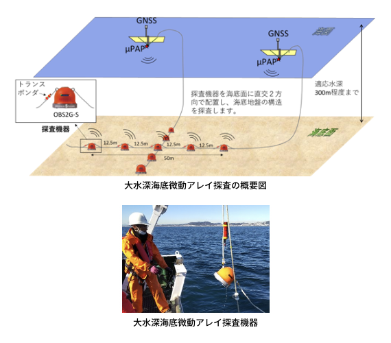 当社は、日本海洋事業(株)と共同で、浮体式が適用される水深50~300mの海域でも海底地盤の構造 (S波速度、工学的基盤) が把握できる「大水深海底微動アレイ探査機器」を開発しました。