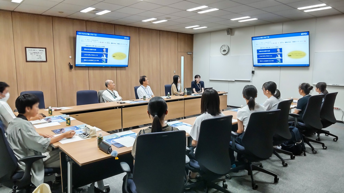 訪問では、当社の事業全般についてご紹介した後、同校のOBである当社社員が中心となり、現在の職務内容や、当社に入社した理由、仕事のやりがいなどについてお話しました。