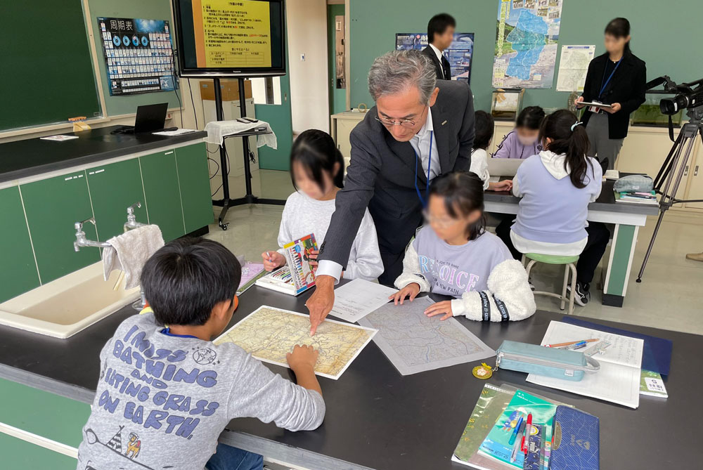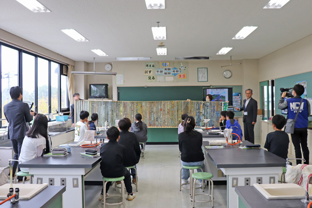 5年生、6年生のクラスでそれぞれ、地すべりや液状化現象の模型実験、地形図の比較などを通じて、児童が災害のメカニズムや地域の地形・地質について学びました。専門家の視点から町内で起こりうる災害などをわかりやすく解説し、理科への興味を育むとともに、防災知識の習得にもつなげています。