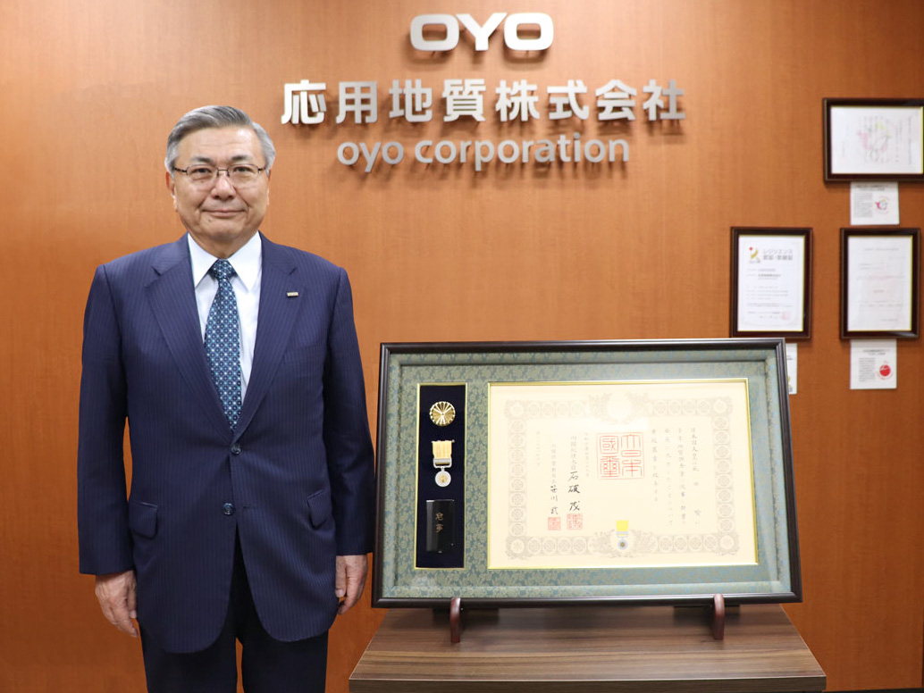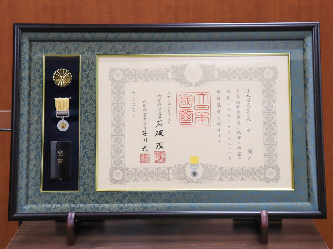 このたびの褒章は、長年にわたり地質調査業に精励し、業界の発展に尽力したことを評価されたものとなります。多くの方々からのご指導とご支援に心より感謝申し上げます。