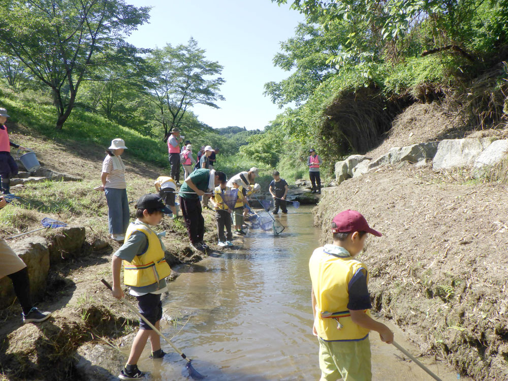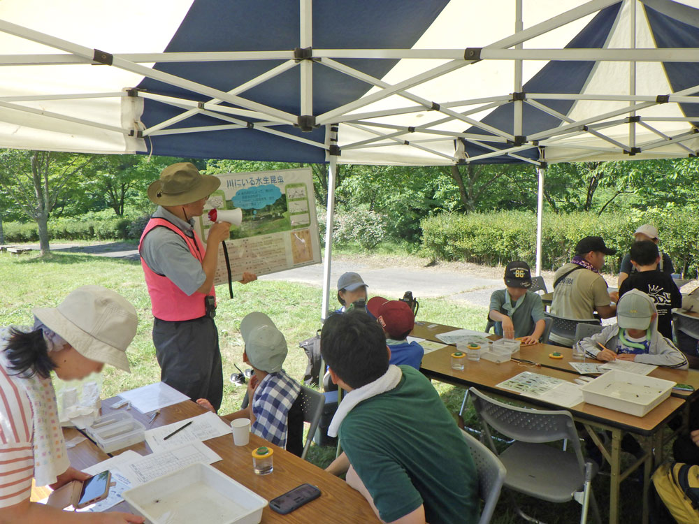 当日は晴天に恵まれ、夏休みに入ったばかりの多くの小学生が参加しました。子どもたちは川で水生昆虫を観察したり、水質を調べるパックテストを体験したりしながら、三春ダム周辺の自然に触れ、楽しく学びました。