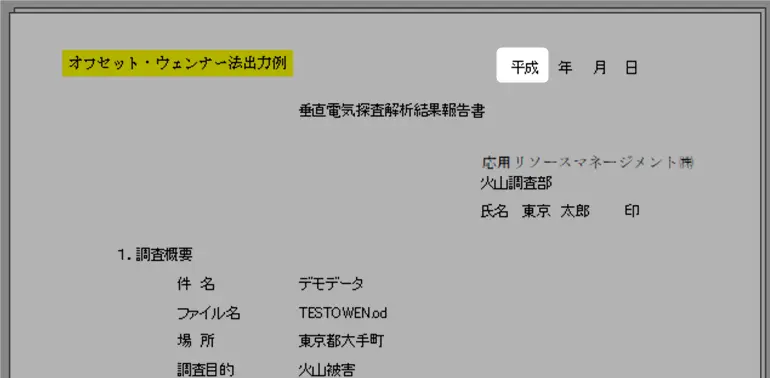 新元号対応に伴い、垂直電気探査解析結果報告書に記載されていた“平成”の表示を取りやめることにいたしました。ver.1.09より対応となりますので、ご容赦のほど、よろしくお願いいたします。