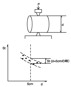 上式のように、Stは供試体寸法により変化するため、d=5cmの時のStを標準とします。