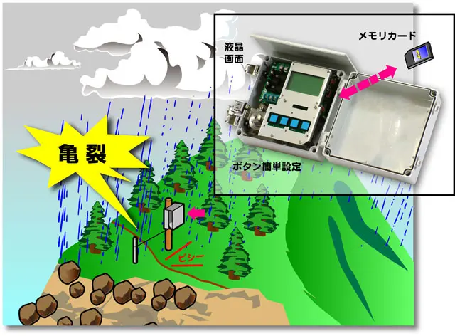 地すべりの心配がある斜面や岩盤にワイヤーを張って、地表面の移動変位を長期にわたり高い精度でモニタリング可能なデジタル地表面伸縮計です。