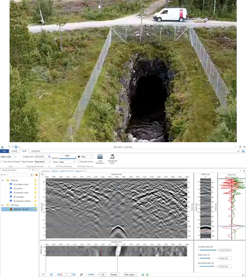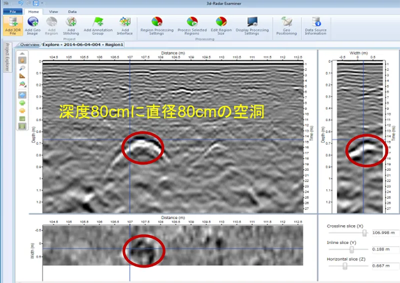 - 水平断面 (深度スライス) 画像として表現できますので空洞や埋設物の広がり・方向を容易に把握できます。