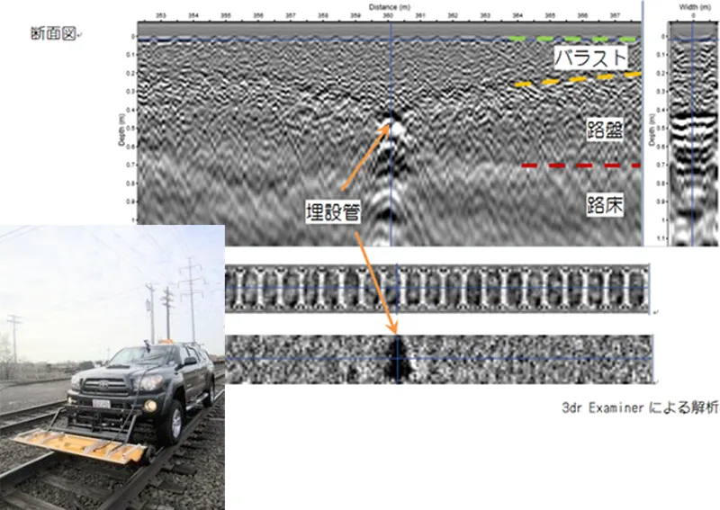 道床厚や路盤の変状に加え、水分含有状況等の調査が可能