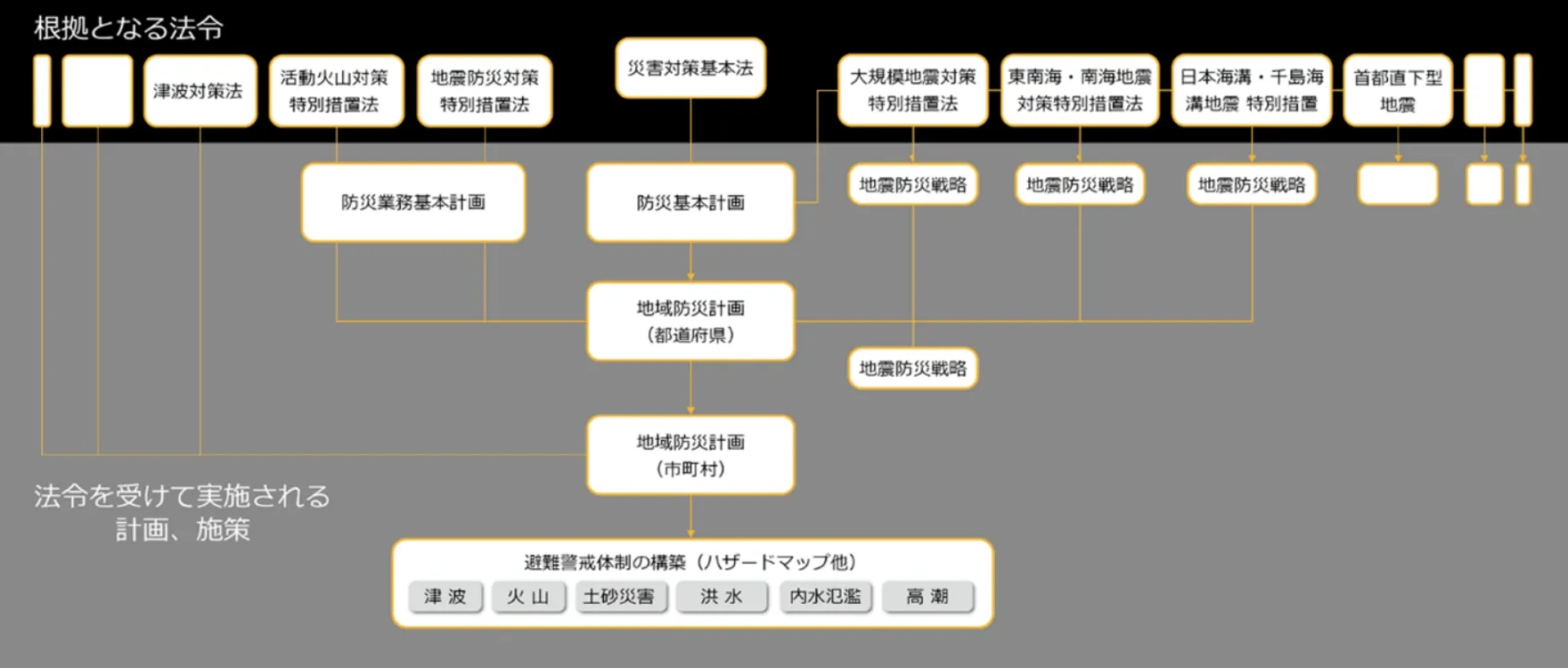 わが国の防災対策は、下図のような枠組みの中で、基本的に法律に基づいて計画・執行されています。すなわち、「災害対策基本法」に基づき、国、都道府県、市町村などの階層ごとに各種の防災計画が策定され、策定された計画に基づき、地域での具体的な防災対策事業が執行されています。