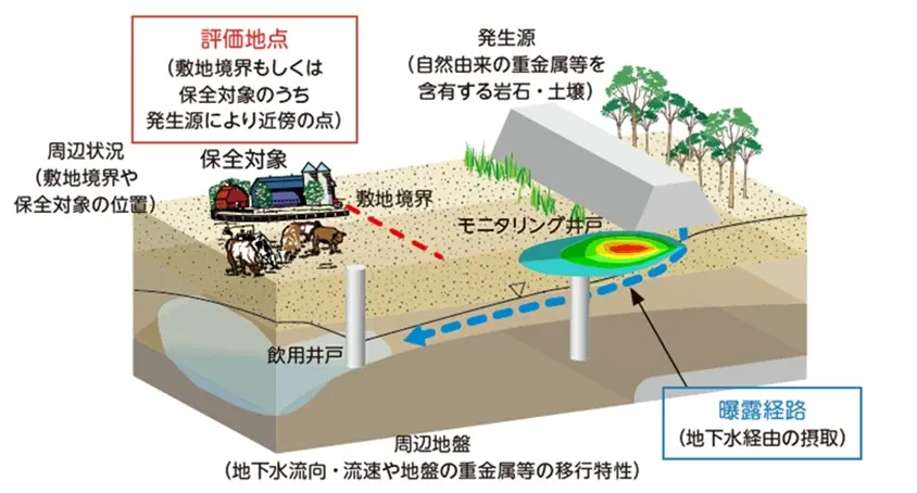 自然由来の重金属等を含有する岩石・土壌の発生源ではなく、敷地境界や飲用井戸のある地点等でのリスク評価を行います。保全対象への影響の有無を確認することで、サイト毎にリスク評価を行い、措置を決定します。また評価地点における将来的な地下水濃度について3次元での移流分散解析を行うことで、プロセスを可視化します。