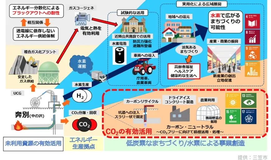 地域に賦存する豊富な石炭を地下ガス化 (UCG※) し、UCGから分離した水素を地域の産業等で利活用するとともに、同時に発生するCO2は地中深くに固定・貯留させることで、新たな地域振興事業の創出と脱炭素まちづくりを目指す取り組みです。